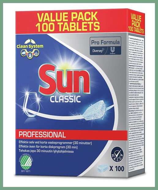 Konetiskitabletit Sun Pro Formula 102kpl. Tämän erinomaisen siivousvälineen toimituksen kesto verkkokaupasta tilattuna 1-2 päivää. Sun on ympäristömyötäinen tuotemerkki, joka edistää kestävämpää elämäntapaa planeetallamme: tabletit eivät sisällä fosfaatteja ja ne sisältävät 70 % luonnosta peräisin olevia ainesosia. Tablettien liukoinen suojakääre on biohajoava. Voit käyttää tabletteja astianpesukoneen eko-ohjelmissa, mikä vähentää sekä veden että energian kulutusta. Esihuuhtelua ei tarvita. Täydellinen valinta astioiden puhdistukseen, sopii manuaalisesti annosteltaviin astianpesukoneisiin. Pesu, huuhtelu, suola, lasinsuojaus, matala lämpötila ja koneen suojaus yhdessä tabletissa. Erinomainen pesutulos, fosfaatiton ja ympäristöystävällinen. Sisältää 70 % luonnosta peräisin olevia ainesosia, liukoinen suojakääre on biohajoava. Poistaa vaikeat rasva-, kahvi-, tee- ja huulipunatahrat, ei tarvitse esihuuhtelua. Sisältää huuhteluaineen ja suolan. Konetiskitabletit myydään pakkauksittain. pakkauksessa on 102 kappaletta. Täsmällinen kuljetuspalvelumme toimittaa konetiskitabletit toimitusosoitteeseen klo 8 - 15 välillä. Turku, Oulu, Helsinki... eli kaikkialle Suomeen.
