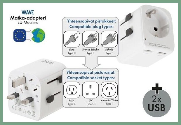Matka-adapteri Wave. Se on hyvä tietokonetarvike, jonka toimitus hoidetaan heti kun sitä saapuu varastoon (n. viikko). Wave Matka-adapteri kolmella sovitinkytkimellä ja kahdella USB liitännällä. Sovittimien avulla sähkölaitteet saa sopimaan pistorasioihin ulkomailla. USB-porttien kautta suora latausmahdollisuus yhteensopivaa kaapelia käyttämällä. Väri: valkoinen. Pistokkeet: Type C ( Euro ) Type E ( French Schuko ) Type F ( Schuko ) Pistorasiat: Type B ( USA) Type G ( UK ) Type I ( Australia / China ). Varma sopimuskuljetuksemme toimittaa matka-adapterin toimitusosoitteeseen työpäivän aikana (8 - 15). Helsinki, Turku, Tampere... toisin sanoen kaikkialle Suomeen.