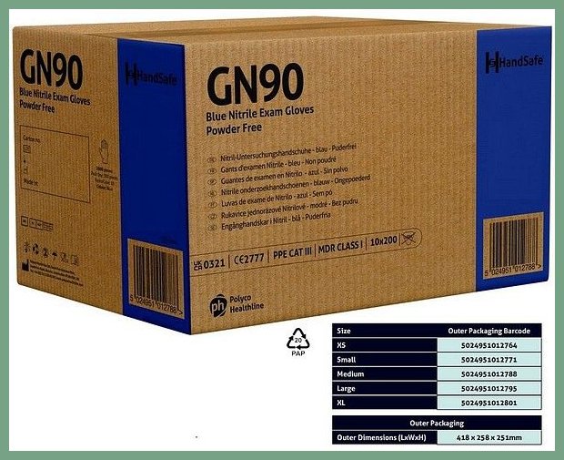 Nitriilikäsine HandSafe GN90 9/Large sininen puuteriton 200kpl. Se on hyvä käsine, jonka verkkokauppatilauksen toimitus perille kestää 1-2 päivää. Ominaisuudet: Täyttää C-tyypin kemikaalienkestävyyden standardin EN ISO 374-1 vaatimukset Täyttää standardin EN ISO 374-5 vaatimukset bakteereilta, sieniltä ja viruksilta. Soveltuu käytettäväksi sytotoksisten / kemoterapialääkkeiden kanssa (cytotoxic/chemotherapy). Käsineen sormiosassa teksturoitu pinta, jonka ansiosta käsineiden kanssa työskentely on mukavaa ja varmaa. Elintarviketurvallisuus: Sopii elintarvikekontaktiin - kaikki elintarviketyypit. Katso lisätietoja liitteenä löytyvästä elintarvikeyhteensopivuustaulukosta. Materiaalikoostumus: Valmistettu nitriilibutadieenipolymeeristä. Puuteriton käsine: vähentää pölykontaminaation riskiä Silikoniton: Käsineiden silikonijäämät voivat häiritä maalaus-, pinnoitus- tai liimausprosesseja ja aiheuttaa mahdollisesti vikoja. Nämä silikonittomat käsineet auttavat minimoimaan tämän riskin varmistamalla puhtaat käyttöpinnat. Kertakäyttökäsineiden standardit: AQL 1.5. Täyttää eurooppalaisen standardin EN455 vaatimukset: Kertakäyttöiset lääketieteelliset käsineet, osat 1, 2, 3 ja 4. EU-sertifioitu: Valmistettu eurooppalaisen henkilönsuojaimia koskevan asetuksen (EU) 2016/425 mukaisesti. Testattu komission asetuksen (EU) N:o 10/2011 mukaisesti elintarvikekontaktia varten. Testattu eurooppalaisten standardien EN420, EN ISO 374-1, EN 374-4 ja EN ISO 374-5 mukaisesti. Tämä tuote on luokiteltu luokan I lääkinnälliseksi laitteeksi lääkinnällisiä laitteita koskevan asetuksen (EU) 2017/745 ja Ison-Britannian MDR 2002 (SI2002 nro 618 muutoksineen) (UKCA) vaatimusten mukaisesti. Tehokas toimituspalvelumme kuljettaa nitriilikäsineet toimitusosoitteeseen kello 8.00 - 15.00. Helsinki, Turku, Tampere... siis minne tahansa Suomeen.