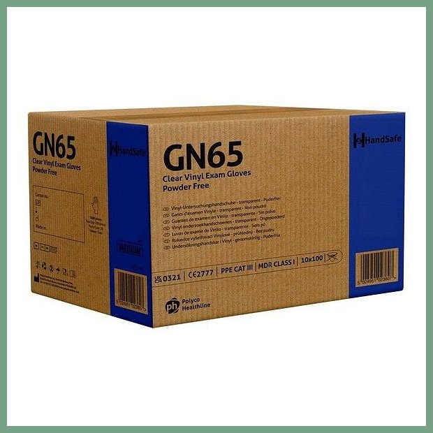 Vinyylikäsine HandSafe GN65 10/XL kirkas puuteriton 100kpl. Se on hyvälaatuinen työkäsine, jonka verkkokauppatilauksen toimitus perille kestää 1-2 päivää. GN65 täyttää standardien EN455: Medical Gloves for Single Use parts 1,2,3&4 sekä EN420, EN ISO 374-1, EN ISO 374-4 & EN ISO 374-5 vaatimukset. Tämä käsine on luokiteltu luokan I lääkinnälliseksi laitteeksi lääkinnällisiä laitteita koskevan asetuksen (EU) 2017/745 ja Yhdistyneen kuningaskunnan MDR 2002 (SI2002 nro 618 muutoksineen) (UKCA) vaatimusten mukaisesti. Tekniset tiedot: materiaalin paksuus sormenpää: 0,09 mm, materiaalin paksuus kämmen: 0,07 mm, tyypillinen paino: 5 g. Materiaali: PVC-plastisol. Lateksiton tuote vähentää allergisia reaktioita. AQL 1.5. Täsmällinen toimituspalvelumme kuljettaa vinyylikäsineen toimitusosoitteeseen kello 8.00 - 15.00. Kuopio, Turku, Helsinki... toisin sanoen kaikkialle Suomeen.